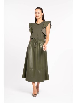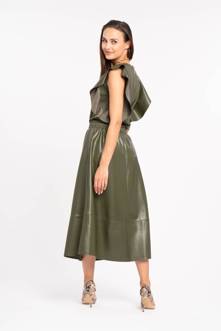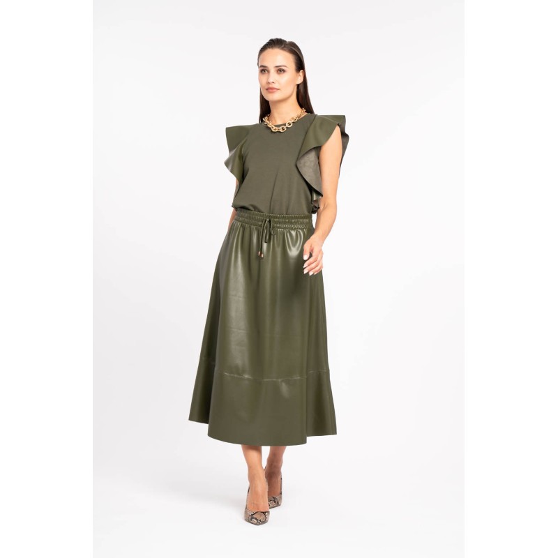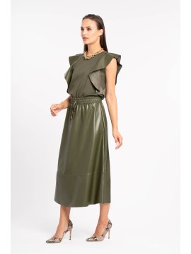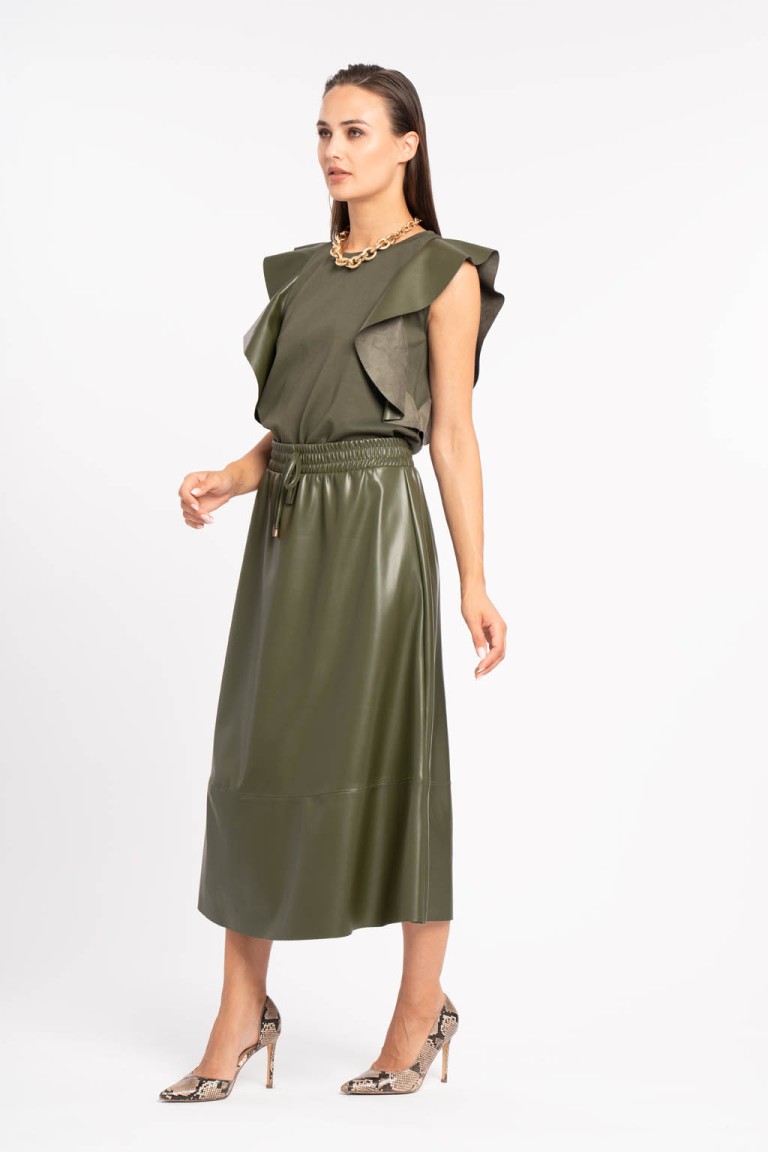 Blusa girocollo modello senza maniche. Dettaglio di rouches in ecopelle sulle maniche. Modello dalla linea dritta. Vestibilità: regolare